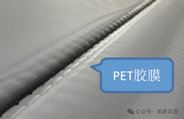 同时还采用PET胶膜涂覆密封工艺,通过热熔胶膜一次成型技术,在风管缝制同时,由自动化设备在风管内侧所有缝线位置处涂覆PET胶膜,以阻断缝线针孔位置处的风管漏风。