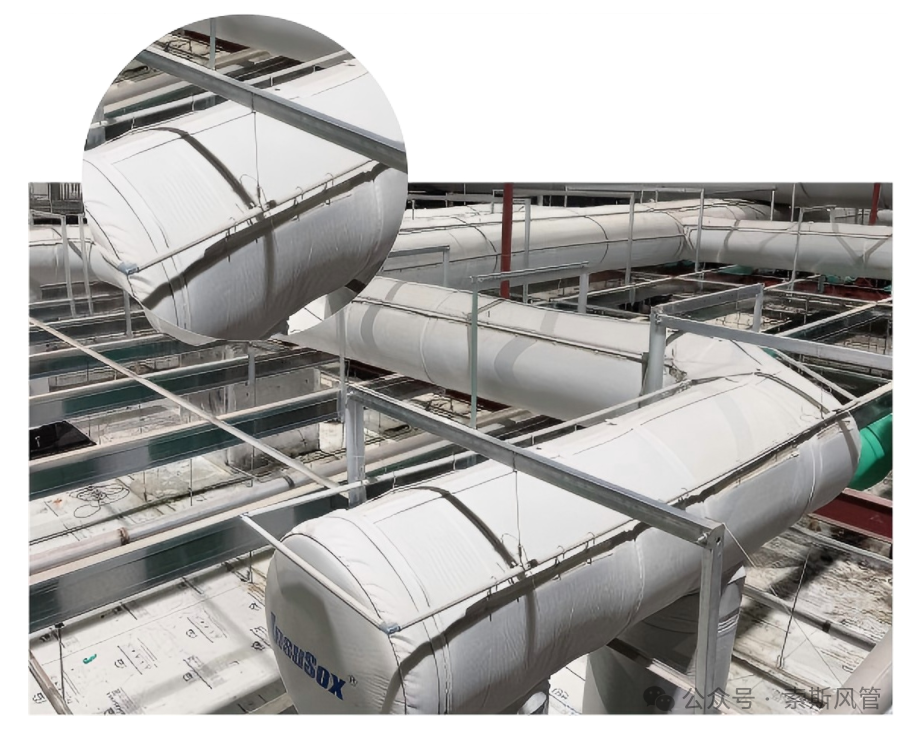 绝热索斯Insusox-I系列风管在悬挂工艺上也进行了全面升级,采用了一体式包条设计,使得安装过程更加简便。通过特制的金属螺纹滑杆穿入包条内,极大的增强了滑杆的稳固性,确保了风管在运行过程中受力均匀,保证了系统的稳定运行,也使得整个系统更美观。